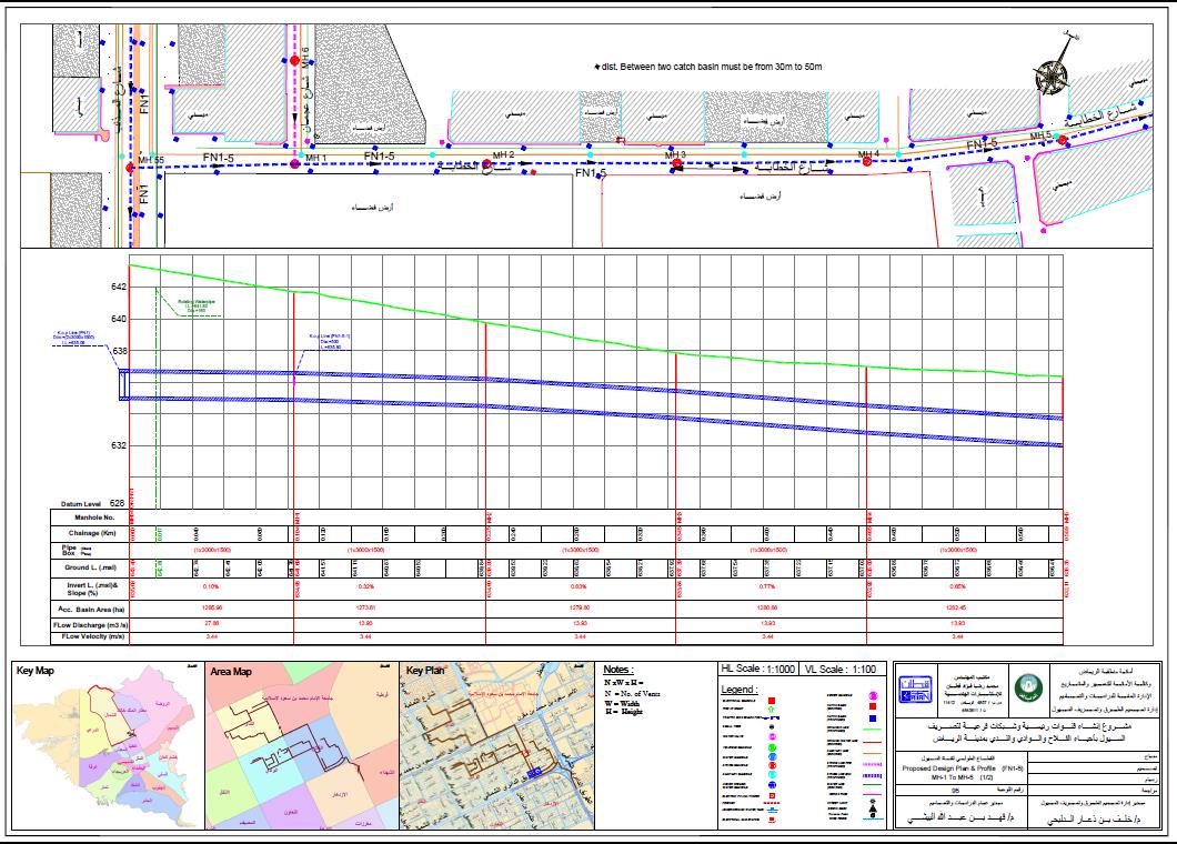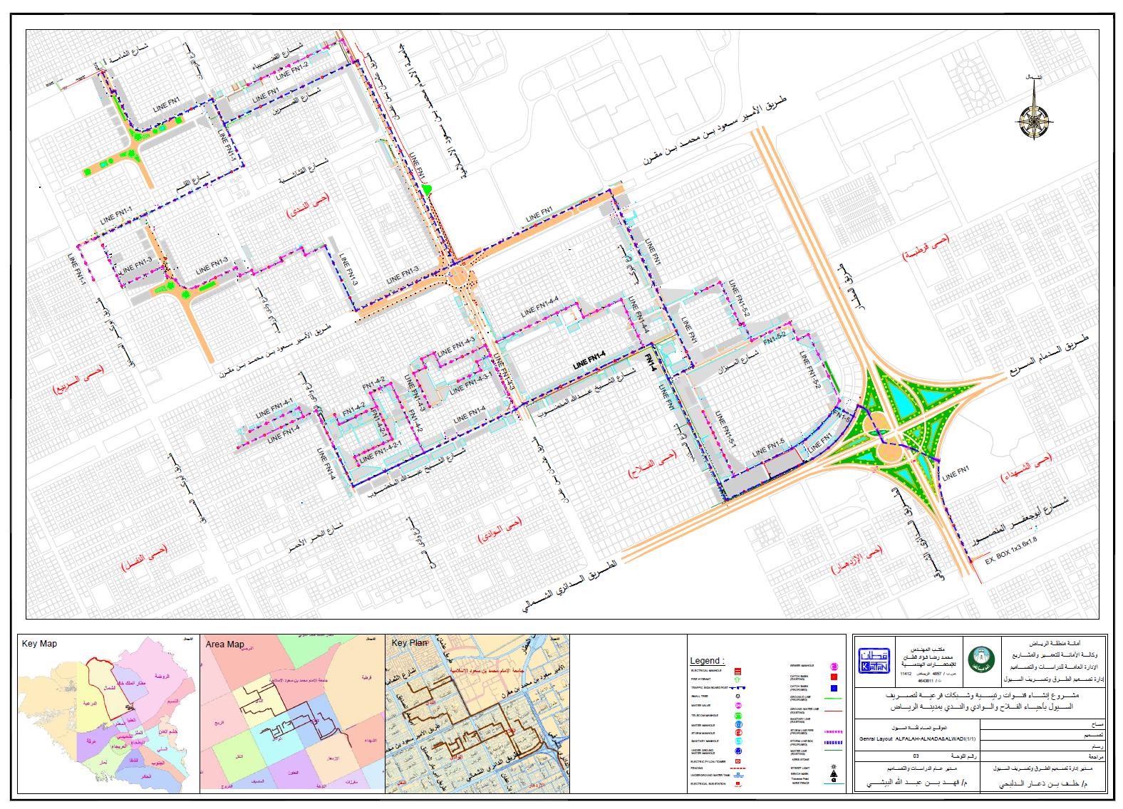 يهدف هذا المشروع لدراسة تصاميم شبكات تصريف مياه السيول والأمطار بأحياء متفرقة بمدينة الرياض التابعة لامانة منطقة الرياض والهدف منها حماية هذه الاحياء من الخطر الناتج من السيول وقيام المكتب بعمل تصاميم شبكات تصريف مياه السول والامطار واعداد مستندات طرح المشروع للتنفيذ ( جداول الكميات المسعره ووثيقة العقد والمواصفات) يهدف هذا المشروع لدراسة مواقع تجمعات مياه السيول والأمطار ف أحياء الفلاح و الوادي والندي بمدينة الرياض بهدف حماية هذة الأحياء من المخاطر الناتجة من تجمعات مياه السيول وقيام المكتب