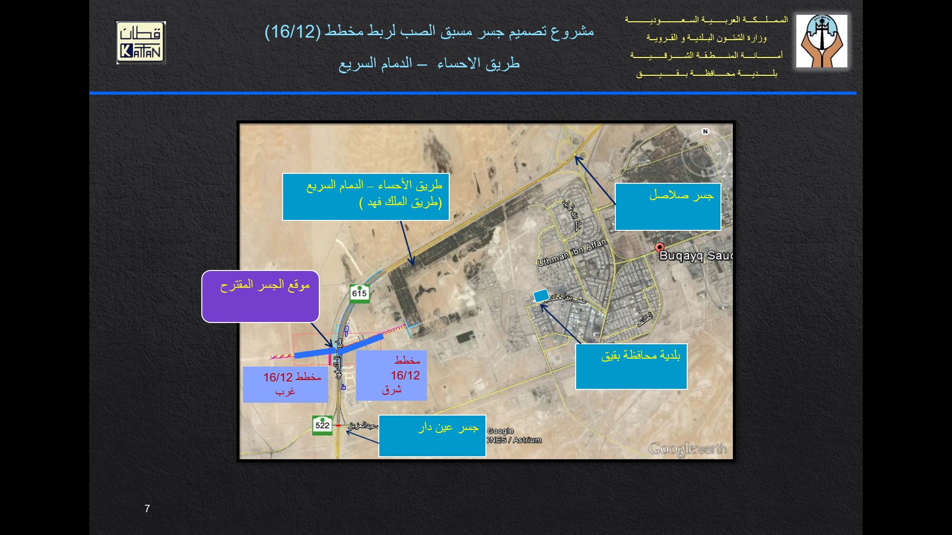 يقع على طريق (الإحساء - الدمام) السريع بمحافظة بقيق لربط المخطط (16/12) من خلال شارعين بعرض (40 م) يقعان داخل المخطط شرق وغرب طـريق (الإحساء - الدمام) السريع. يمر الجسر فوق طريق (الإحساء ـ الدمام) السريع بعرض (84م) ، وحمى خط أنبوب تحلية المياه وخط كهرباء الضغط العالي بعرض (100 م) ، والذي يقع غرب الطريق السريع، ويمر أيضاً فوق شارع بعرض (40 م) موازياً ومجاوراً لحمى خط المياه والكهرباء.